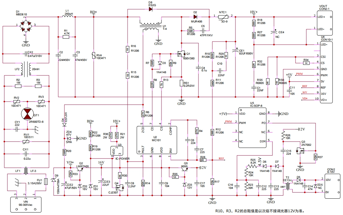 输入电压范围90~265V1、启机<0.5S2、整体设计精简,后级无EMI问题;3、调光深度<1%,阶梯<0.1%;4、PFC>0.95THD<10效率>96%频闪<0.4%;5、输出410V~470V支持输出开短路保护;6、高速动态回应,全程调光无闪灯;7、MCB02A恒流模块耐压500V最高可驱动250W;